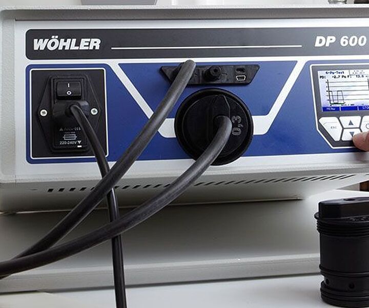Novo: Prikladno i za potvrdu dovoljnog dovoda zraka za izgaranje prema DVGW 625 („jednostavni postupak“ i „detaljan postupak“) s potrebnim ispitivanjem diferencijalnog tlaka (test od 4 Pa). Neće biti potreban pomoćni mjerni instrument. Wöhler DP 600 simulira ulaz zraka za izgaranje u kaminu. Nakon što korisnik unese kapacitet kamina, Wöhler DP 600 će automatski proizvesti odgovarajući volumenski protok koji prolazi kroz dimnjak i registrirati progresiju tlaka u prostoriji.